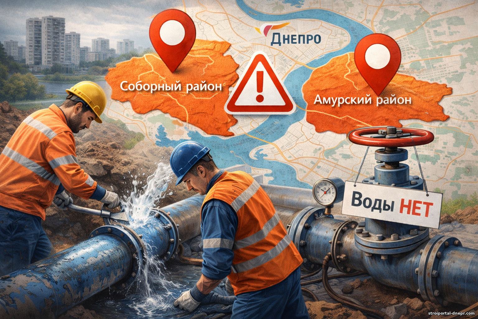Увага! У зв'язку з аварійними роботами на водопровідних мережах у Дніпрі сьогодні, 2 січня, відбудеться тимчасове відключення холодної водопровідної води у двох районах міста. Це необхідно для термінового усунення пошкодження на магістральних мережах та забезпечення надалі стабільного водопостачання.