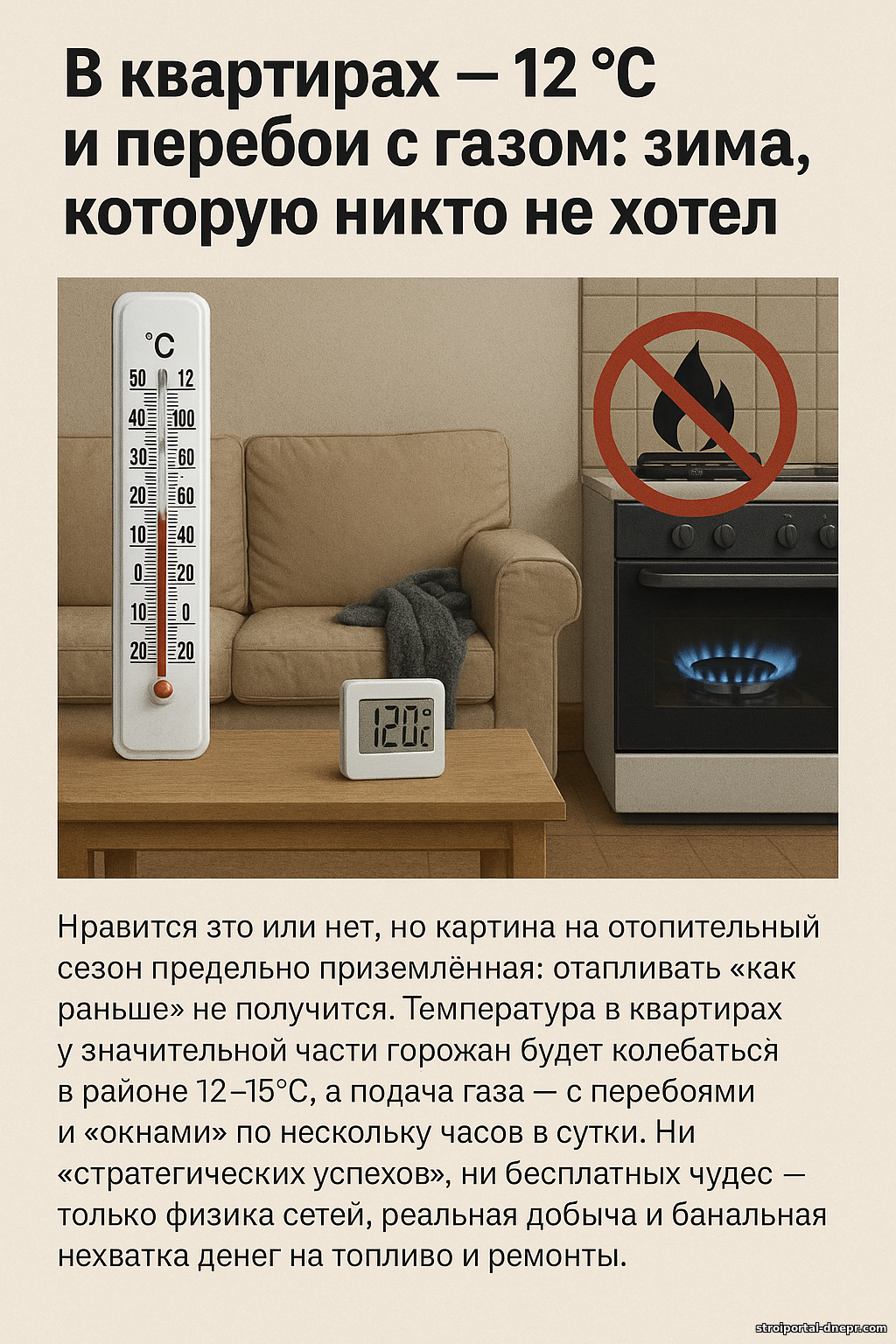 Нравится это или нет, но картина на отопительный сезон предельно приземлённая: отапливать «как раньше» не получится. Температура в квартирах у значительной части горожан будет колебаться в районе 12–15 °C, а подача газа — с перебоями и «окнами» по нескольку часов в сутки. Ни «стратегических успехов», ни бесплатных чудес — только физика сетей, реальная добыча и банальная нехватка денег на топливо и ремонты.